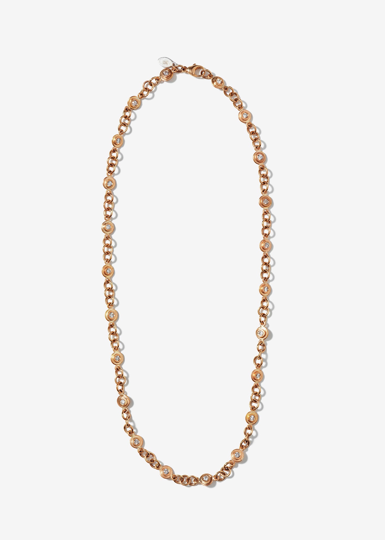 The Stardust Diamond Disc Necklace is a handcrafted masterpiece featuring 65 petite 14K Gold discs, each intricately set with sparkling white diamonds. Designed to catch the light from every angle, this necklace shimmers with subtle movement and effortless elegance. Adjustable from 16 to 18 inches, it layers beautifully and embodies Tina Negri’s signature style; authentic, playful, and endlessly chic.